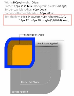 从图中我们可以了解到:圆角border-radius,阴影扩展半径、阴影模糊半径以及padding是如何影响对象阴影的:非零值的border-radius将会以相同的作用影响阴影的外形,但border-image不会影响对象阴影的任何外形;对象阴影同box模型的层次一样,外阴影会在对象背景之下,内阴影会在边框之下背景之上。我们知道,默认情形背景图片是在背景颜色之上的。所以整个层级是:边框>内阴影>背景图片>背景颜色>外阴影。