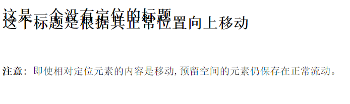 <h2>这是一个没有定位的标题</h2> <h2 class="pos_top">这个标题是根据其正常位置向上移动</h2> <p><b>注意:</b> 即使相对定位元素的内容是移动,预留空间的元素仍保存在正常流动。</p>
