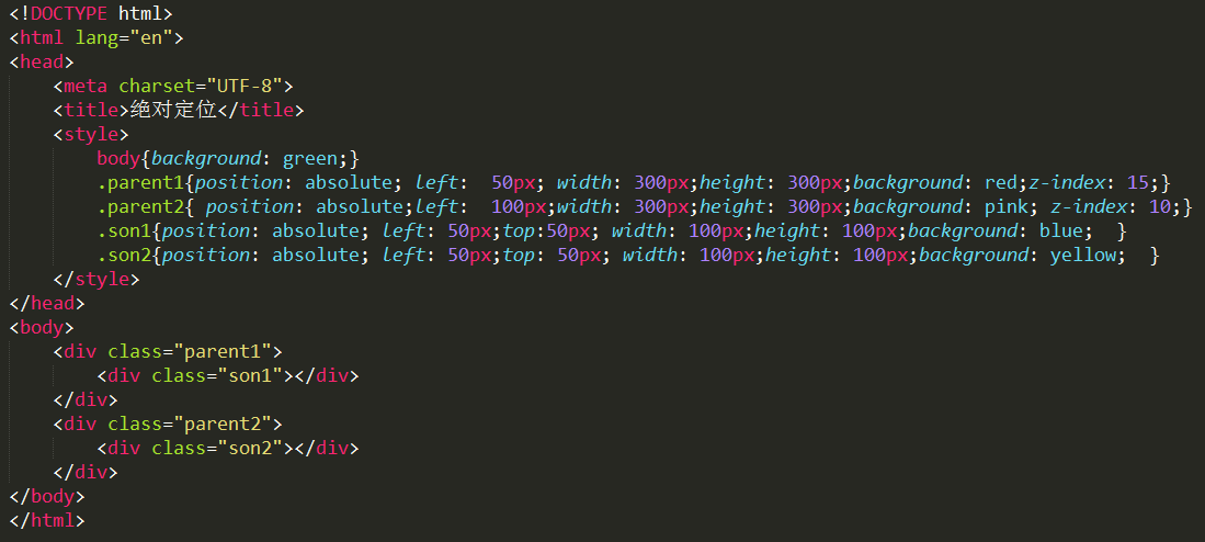 例12.当然,如果我们把两个son的z-index都设置位负数如-5,那么两者就都会被父元素所覆盖:
