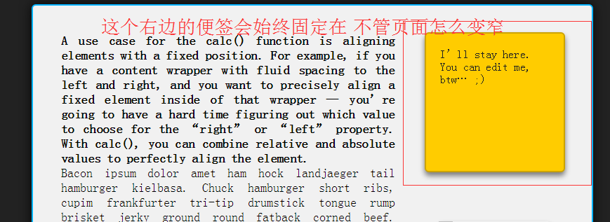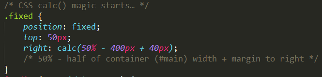 calc() 的另一个作用是用来对其position:fixed的元素 比如你有一个内容封装器。 左右都有流动的间距 你希望在这个内容封装器内精准对其position:fixed的元素。但是这种情况要计算left和right属性的具体赋值就很难。通过calc() 可以精准定位。
