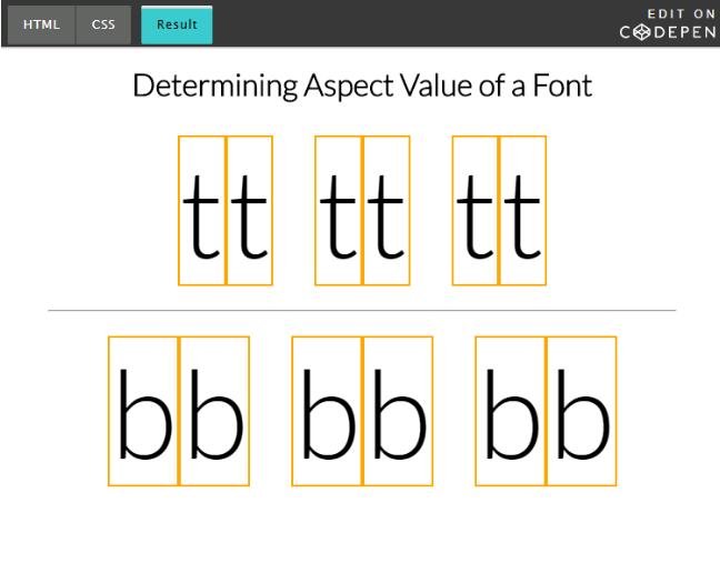 在下面的 demo 中,我创建了一个边框围绕着字母 ‘t’ 和 ‘b’ 并且对每组字母应用了不同的 font-size-adjust 属性值。