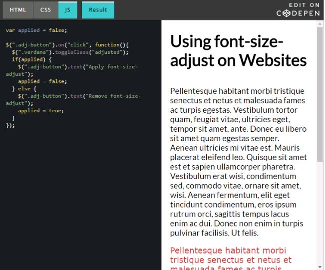 以下 demo 使用的 font-size-adjust 取值于上一个 CodePen demo 中为 ‘Lato’ 字体设置的值,现在将会用来调整 ‘Verdana’ 这个候选字体。会有一个按钮控制修改是否发生,所以你可以看出修改前后的变化: