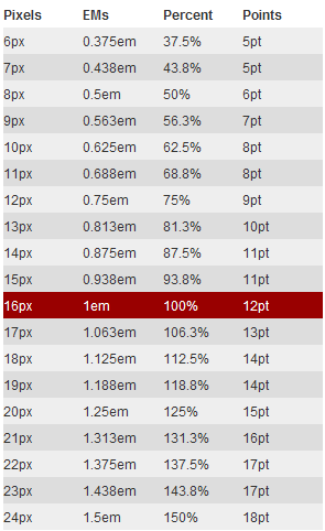 这种技术需要一个参考点,一般都是以<body>的“font-size”为基准。比如说我们使用“1em”等于“10px”来改变默认值“1em=16px”,这样一来,我们设置字体大小相当于“14px”时,只需要将其值设置为“1.4em”。