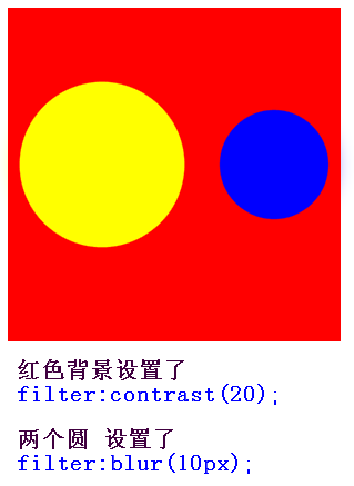 图中 红色背景 设置了 filter:contrast(20); 这点很重要,两个圆设置了 filter:blur(10px); 如果还不清楚,我们对比看看。