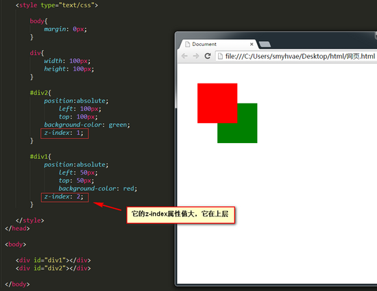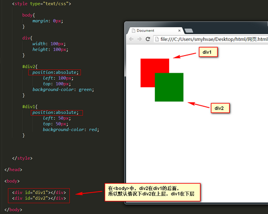 这是默认情况下的例子:(div2在上层,div1在下层)