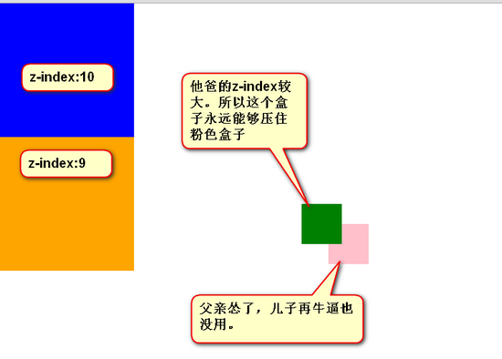 (4)只有定位了的元素,才能有z-index值。也就是说,不管相对定位、绝对定位、固定定位,都可以使用z-index值。 而浮动的元素不能用 。