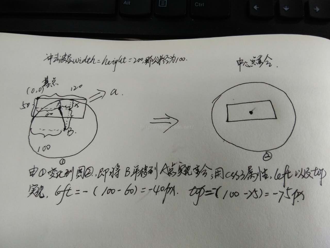 观察波由小变大,涉及的css3属性变化有width,height,left,top,opacity,首先通过伪类实现冲击波层,同时需要设置冲击波前后的中心点位置(这里涉及一点点数学知识:画图计算两个点的位置),最后设置transition-duration: 0实现瞬间变化,ps学习到用a:active可以模拟鼠标实现点击的效果