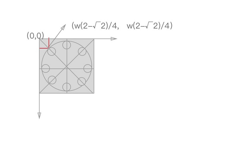 后来看到 同学po的文章css3实现10中loading效果, 按照JRd3的代码确实可以实现很好看的效果,但是当我想换一换loading圆圈大小的时候,样式就崩了,经过分析,他们的坐标是存在某种数学关系的,如下图所示,在竖直或横线上的坐标可通过50%定位,斜线上的坐标如图中所示,其中w是矩形的宽高或者说是8个小圆圈所围成的大园的半径。