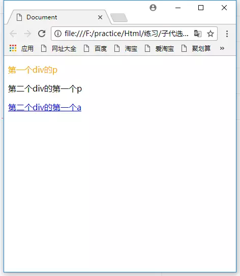 上述样式只作用在第一个<div>的<p>元素。第二个<div>里因为不止<p>元素,还有<a>元素,所以第二个<div>的<p>元素不会被上述样式影响。