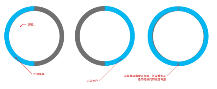 1、首先隐藏了右半圆,这是因为我们需要旋转的是左半圆,我们可以等左半圆转到右边圆的位置再显示右 边,就是等到旋转到180度的时候。