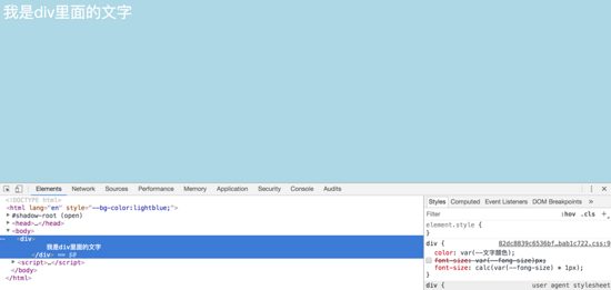 此时div里面的文字的大小是多少呢?是浏览器默认的大小,为什么不是咱们想象的30px呢,这是因为变量转换的时候末尾会带上空格, var(--fong-size)px 会转换成 30 px