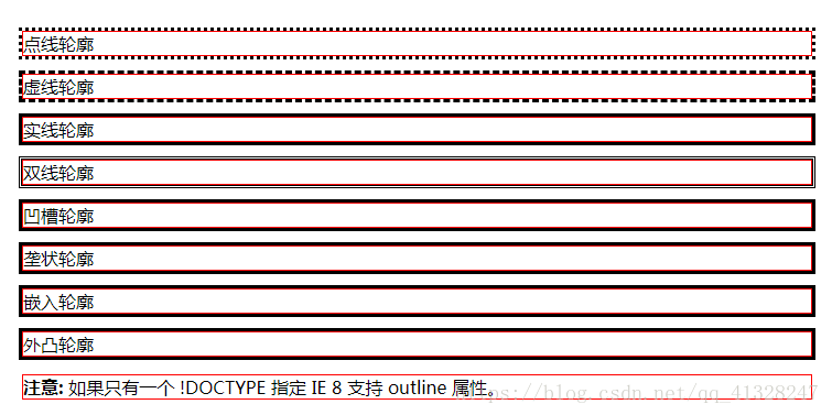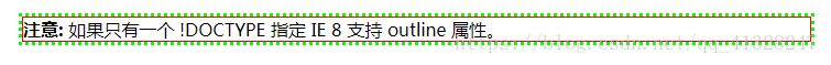 <p><b>注意:</b> 如果只有一个 !DOCTYPE 指定 IE 8 支持 outline 属性。</p>