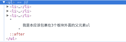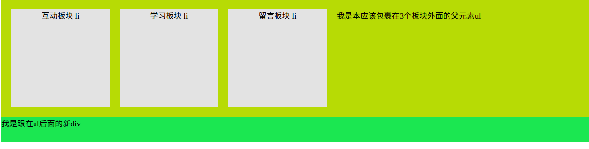 通过上图可以看到,当三个板块左浮动以后,因为它们脱离了正常文档流,所以它们的父元素ul在不设置高度的情况下,无法被子元素撑开(能够看到背景色是因为我设置了ul的padding为10px),所以当你在后边新增元素的时候,自然会排在ul后边,也就是插入到了3个浮动的板块下面。