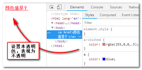 使用 :visited 伪类选择器控制颜色的时候,虽然语法上支持半透明色,但是表现上,要么纯色,要么全透明。