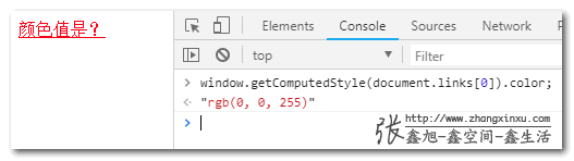 结果输出的是: "rgb(0, 0, 255)" ,也就是蓝色blue对应的RGB色值。