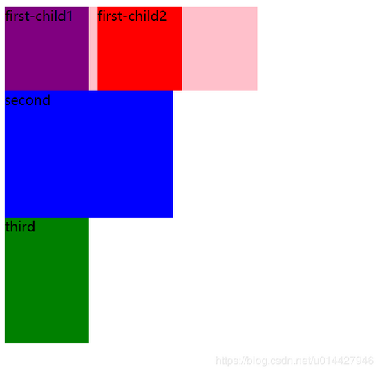 由上面的例子可以看出,first盒子没有设置高度,由子元素撑开,但是由于子盒子设置了浮动,脱离了标准流,所以导致first盒子没有高度,表现为second和third盒子向上移动了。
