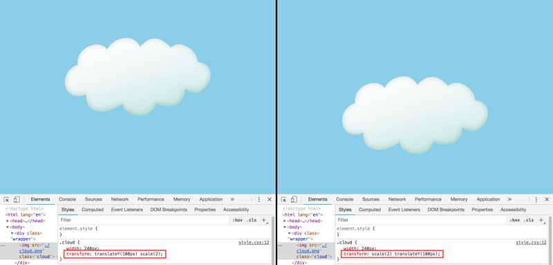 如果先translate再scale,平移的距离也将被等比例缩放,而先scale再translate则不会。所以在使用transform需按照 translate -> rotate -> scale 的顺序书写,让scale先执行,以免放大translate的效果,而rotate先translate执行以防止带着平移的距离一起转动。我觉得这是transform目前不方便的地方,因为方法之间相互干扰并不容易理解,书写顺序也不容易记住。在未来有望通过使用独立的css transform属性解决这一问题,因为独立的transform属性对书写顺序没有依赖,方法之间彼此不会干扰。