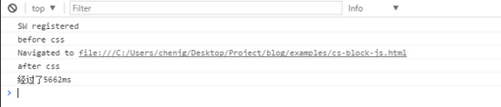 由上图我们可以看到,当css还没加载完成的时候,h1并没有显示,但是此时控制台输出如下