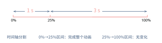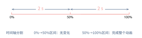 下面,我想让圆圈在起点停留2s后再开始移动,第一反应是用动画属性中的延迟 animation-delay ,把时间定义成2s,行不行?行,但这里用个更高级的方法。我们在定义关键帧时用了大量的百分比,这里百分比值代表的是 时间节点 ,也就是说 关键帧定义的是不同时间节点的状态属性。 下面再来看一张图,这张图一定不要和上面的路径演示弄混了,这是一张动画的时间轴的图。
