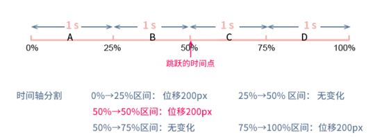 重点看红色的部分,那里就是跃迁的时间点,在无时间变化的情况下位移了200px。按照时间轴的分析,CSS部分理论上是这样的: