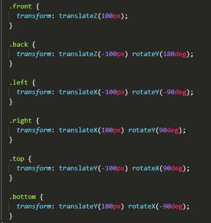 首先说translate的规则,这个自然不必多说,对照着看就可以了,比如说translateZ(-100px)在这幅图中就相当等于图像往-z轴的方向移了100px,形象一点的说法就是“向屏幕内部凹陷了100px”。translateX,translateY以此类推。