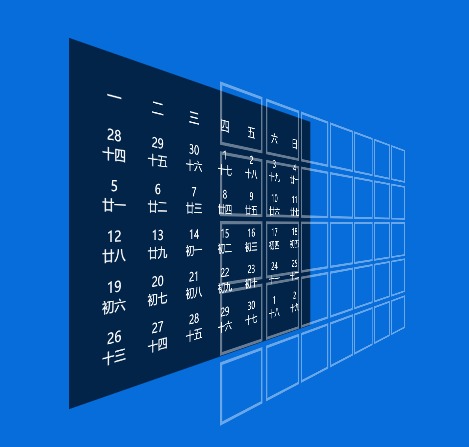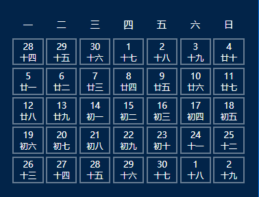 首先,撸好两层日历格子,一层展示日期信息,一层展示探照灯效果的边框。用 flex 布局也好,grid 也好,哪怕 inline-block 也都是没有问题的,这都不重要,重要的是上下两层的格子一定要对齐,然后我们用 relative 的容器把这两层 absolute 层圈起来,固定住。