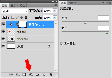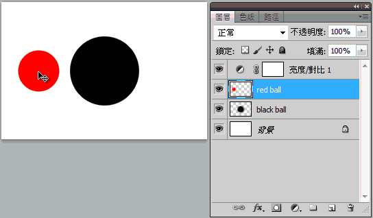 一开始我们来玩Photoshop,会比直接写CSS来得容易理解(没有Photoshop的人也没关系,看完说明也就懂了),首先我们新增两个图层,一个里头放上红色的小球,另外一个里头放上黑色的大球。
