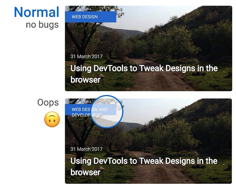 当我们写css的时候,有时候会忘记设计里面存在的临界情况。举个例子来说吧,当内容的长度超过了我们的期望值,我们也无法解释其中的可能性,页面的设计很可能会因此而崩掉。我们不能保证css总是会按照我们期望的那样工作,但至少我们可以用不同类型的内容来测试,以减少这种情况的发生。