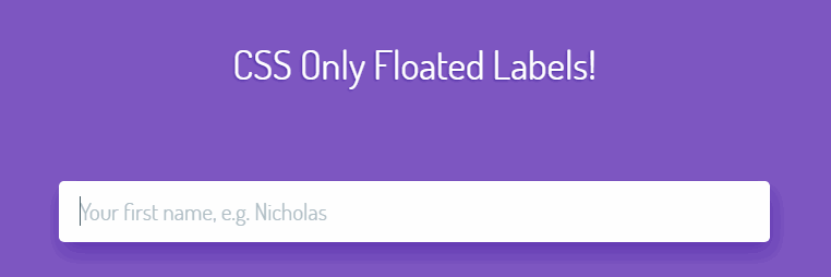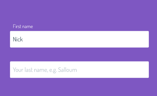 <div class="Input"> <input type="text" id="input" class="Input-text" placeholder="Your first name, e.g. Nicholas"> <label for="input" class="Input-label">First name</label> </div>