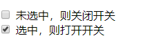 <label for="ck2"> <input type="checkbox" id="ck2"> <span>未选中,则关闭开关</span> </label> <br> <label for="ck1"> <input type="checkbox" id="ck1" checked> <span>选中,则打开开关</span> </label>