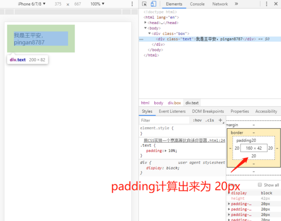 这里我们将父容器 .box 宽度设置为 200px ,子元素 .text 的 padding:10% ,因此 .box 的 padding 计算结果为 20px ;