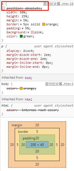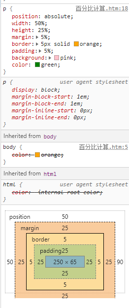当position为absolue时候,其相关属性的百分比是相对它参考的元素(包含块)来进行计算并进行位置渲染的 。