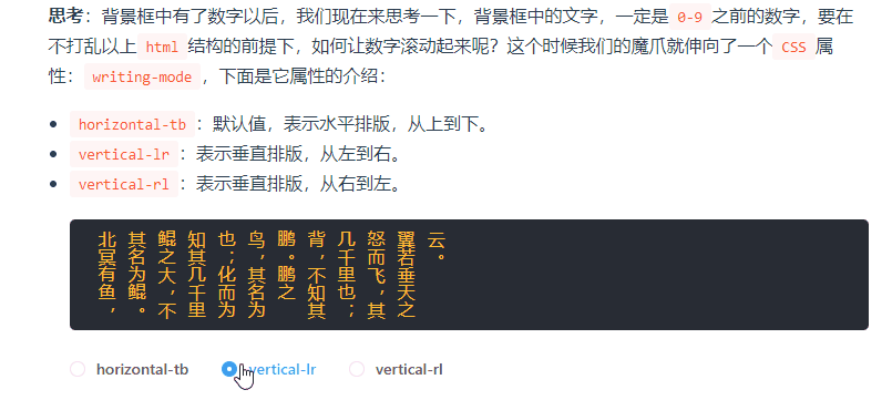 思考:背景框中有了数字以后,我们现在来思考一下,背景框中的文字,一定是 0-9 之前的数字,要在不打乱以上 html 结构的前提下,如何让数字滚动起来呢?这个时候我们的魔爪就伸向了一个 CSS 属性: writing-mode ,下面是它属性的介绍: