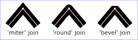 4、 stroke-linejoin 表示描边转角的表现方式。可选值: miter 、 round 、 bevel 、 inherit 。图示如下: