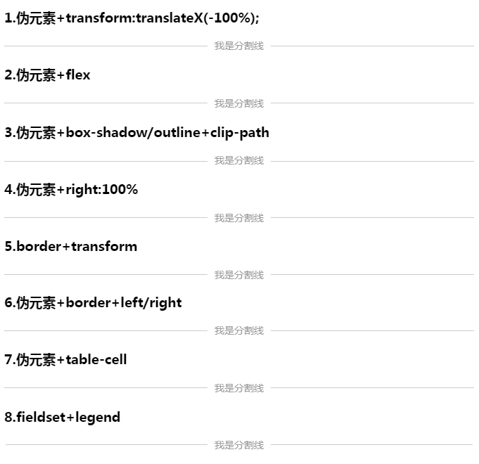 上面一共列举了8中方式来实现分隔线的效果,每种方法思路各不相同,重要的是可以发散自己的想象力,可能这才是CSS与其他语言所不同的吧~