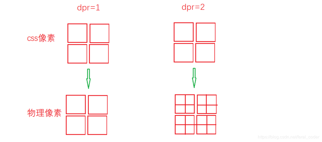 如下图 当我们在网页上设置一个元素的css像素(width:2px;height:2px)时,在dpr=1的显示器上时,最终会占用一个四个物理像素点,当在dpr=2时的显示器上时,会占用16个物理像素点。由此得出结论,在不同屏幕下css像素的物理尺寸是一致的,不同的是一个css像素对应的物理像素点个数不一样