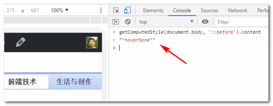 本文就预埋了上面这样的CSS代码,因此,Chrome浏览器下,打开控制台,进入移动端预览模式,输入JS测试下,可以看到我们CSS传递的字符串信息被JS获取到了。