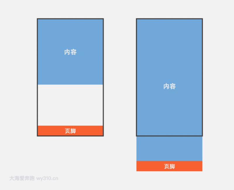 一般指手机页面中,当内容高度撑不满一屏时,页脚紧贴屏幕底部;当内容高度超过一屏时,页脚紧随其后。