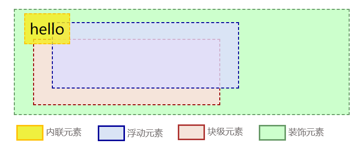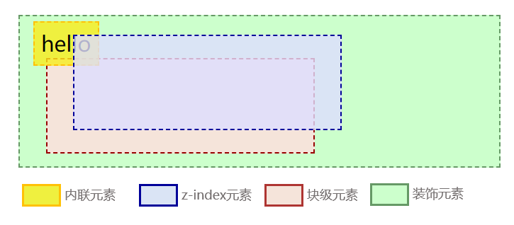默认情况下,图文是网页的核心,因此内联元素的等级理应最高;然后是布局,其中浮动元素(脱离文档流)的等级高于块级元素;最低等级是设置背景、边框等装饰属性的元素。