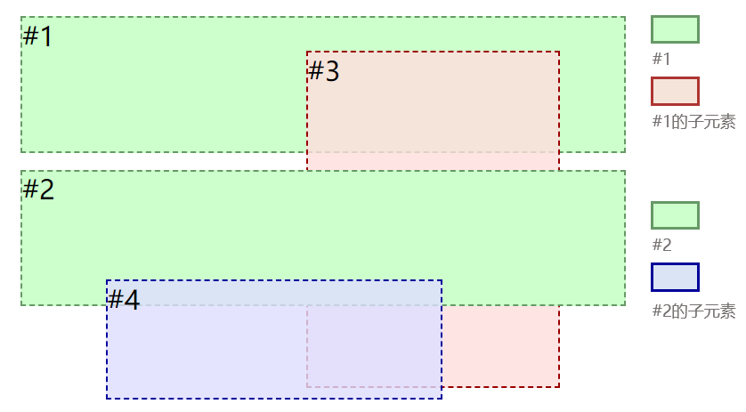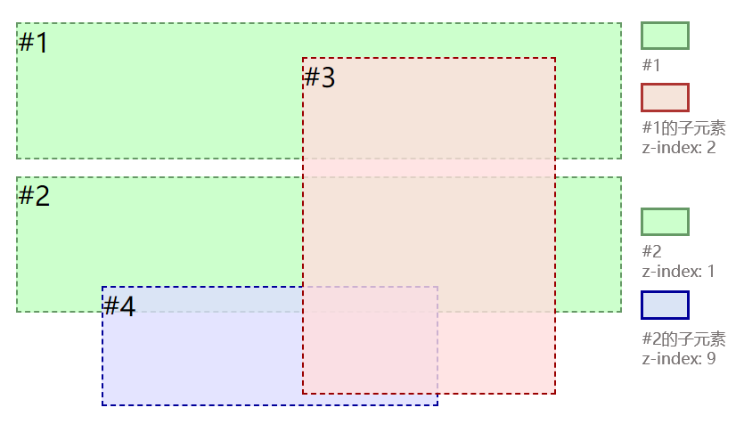 尽管#4的 z-index 值大于#3的,但由于#4属于#2的子元素,其层叠等级完全受制于#2的等级。#2和#3同属于根层叠上下文,且#3大于#2,因此#3在#2(及其子元素)之上。