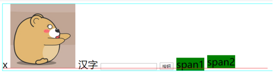 如上图红色为该行元素基线,可以发现图片和overflow:hidden样式的元素的基线位置是最下方,中文、输入框和button按钮的基线位置都在中下方的位置。可以看出,这些行内元素的排列是先按基线上下对齐,然后把父元素撑开。