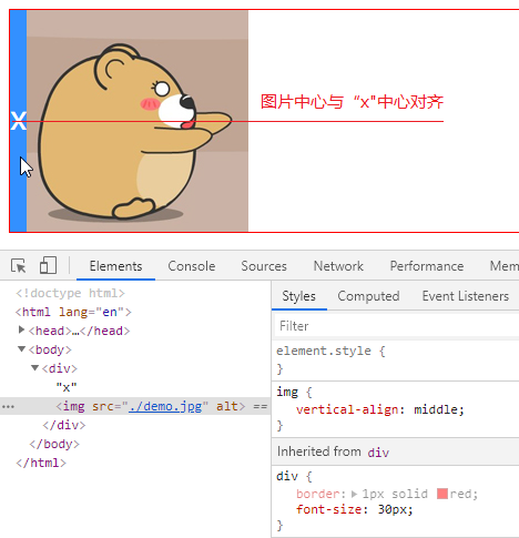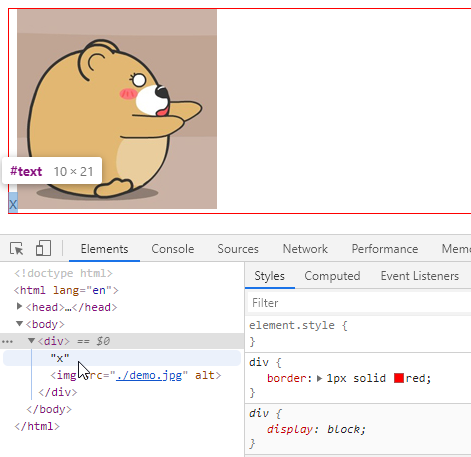 值得注意的一点是,如果我们直接往div中放入一个图片,会发现图片底部距离div的下方有一个空隙;这是因为 行内元素各自基线对齐以后还要和父元素的字体基线保持一致, 换句话说: 每个行内元素的基线都要向父元素字体基线看齐。 但当父元素的行高和字体大小样式改变的时候,会使得父元素字体基线位置改变,从而使得行内元素的位置整体上下移动。虽然我们只看到了一个图片没有看到字,但是父元素有默认的line-height和font-size,也会悄悄地影响布局,你会发现再往div中放入了一个小写字母“x”,如下图,它的下方刚好占据了空隙的位置。所以知道了这个原因,想去掉这个空隙的话,只需要把父元素的line-height和font-size设置为0,或者把图片设置成块级元素,让它独占一行就可以了。同样的,如果div中直接放入一个input输入框,输入框上方也会有个空隙,与此类似,只是图片和输入框的基线位置不同罢了。