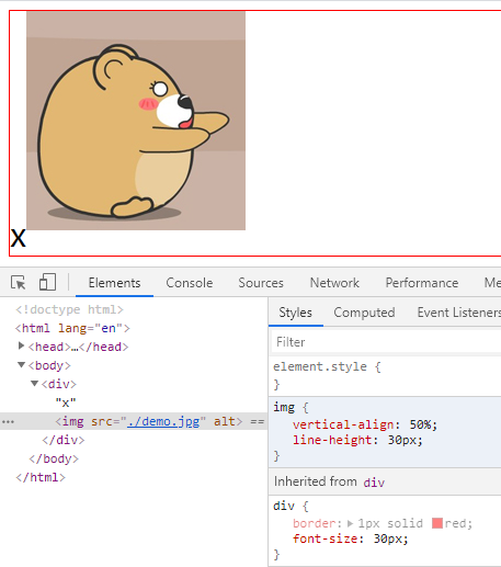 1、当设置属性为"%"的时候,指的是当前行内元素的line-height属性值的占比,可以设置成正负值,行内元素基线相对父元素字体基线上下移动这个百分比的距离。如下图,设置图片vertical-align: 50%; line-height: 30px; 本来图片最下方应该和"x"底部对齐的,现在上移了15px,如果是-50%,就会相对下移15px。当然也可以直接设置为length,vertical-align:15px;效果也是一样的。