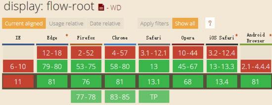 display:flow-root 刚出来的时候,我一看兼容性,啧啧,不知道猴年马月才能用在生产环境,今天又遇到这厮,一查兼容性,嘿,小子,不错嘛,Safari浏览器从版本13开始支持了,距离流行使用指日可待。
