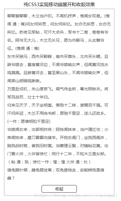 到此这篇关于纯CSS3实现移动端展开和收起效果的示例代码的文章就介绍到这了,更多相关CSS3移动端展开和收起效果内容请搜索脚本之家以前的文章或继续浏览下面的相关文章,希望大家以后多多支持脚本之家!
