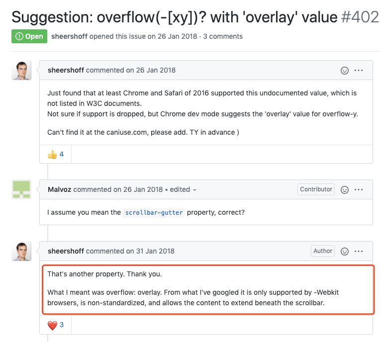 overlay 行为与 auto 相同,但滚动条绘制在内容之上而不是占用空间。 仅在基于 WebKit(例如,Safari)和基于Blink的(例如,Chrome或Opera)浏览器中受支持。