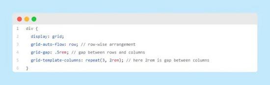 类似地,在逐列排列中,只有当前一列完全填满时(即,前一列中的项目数已等于行数),新列才开始。因此,我们需要知道行数有多少。那么问题来了,我们如何才能知道网格布局中要进行的行数呢?可以通过基本的数学学出来.....。我们现在知道了网格项目的数量,也知道列数。因此,我们要进行行数最小化可以运用此公式Math.ceil(itemsCount/columnsCount),为什么要最小化行数,因为如果我们采用更大的随机整数作为行数,那么网格将无法有效填充,整个布局中会有一些格子没能填充上。以下CSS代码是按列排列的,并且由于我们必须动态的设置grid-template-rows字段,因此以下代码中不存在该字段: