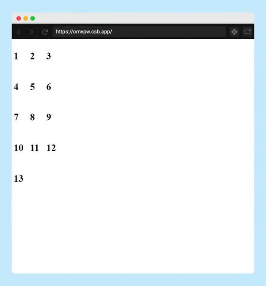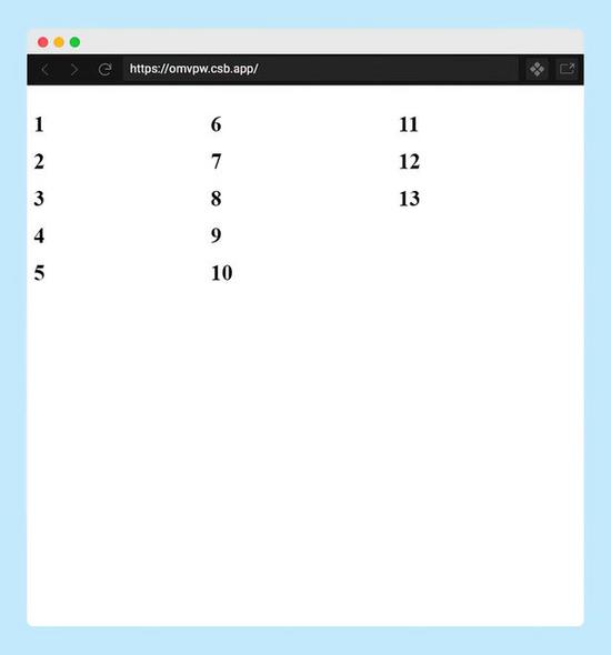 假设我们有n 个项目,并且我们必须在网格布局中将这些项目按列排序。列数是固定的,我们还必须确保网格布局中的行数最少,以便有效填充网格。在本文中,我把数字视为项目。并且根据我们的要求在网格布局中排列1-13之间的数字。列数固定为三。我将使用 React和SCSS(Sassy CSS)对此进行演示。