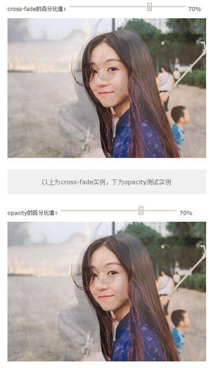 关于 cross-fade() 图像函数中的百分比值改变的仅仅是后面一个图像的透明度,我很久以前做过一个demo页面进行过测试,您可以狠狠地点击这里: CSS3 cross-fade属性透明度作用对象测试