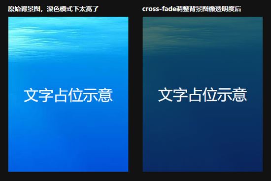某背景图在黑暗模式下太亮了,希望调整下背景图的明暗度,使用 cross-fade() 函数实现就是下面这段CSS代码(宽高设置的CSS略):